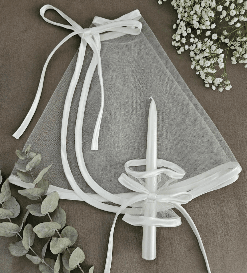 Tiulinės Krikšto skraistės ir žvakės laikiklio komplektas